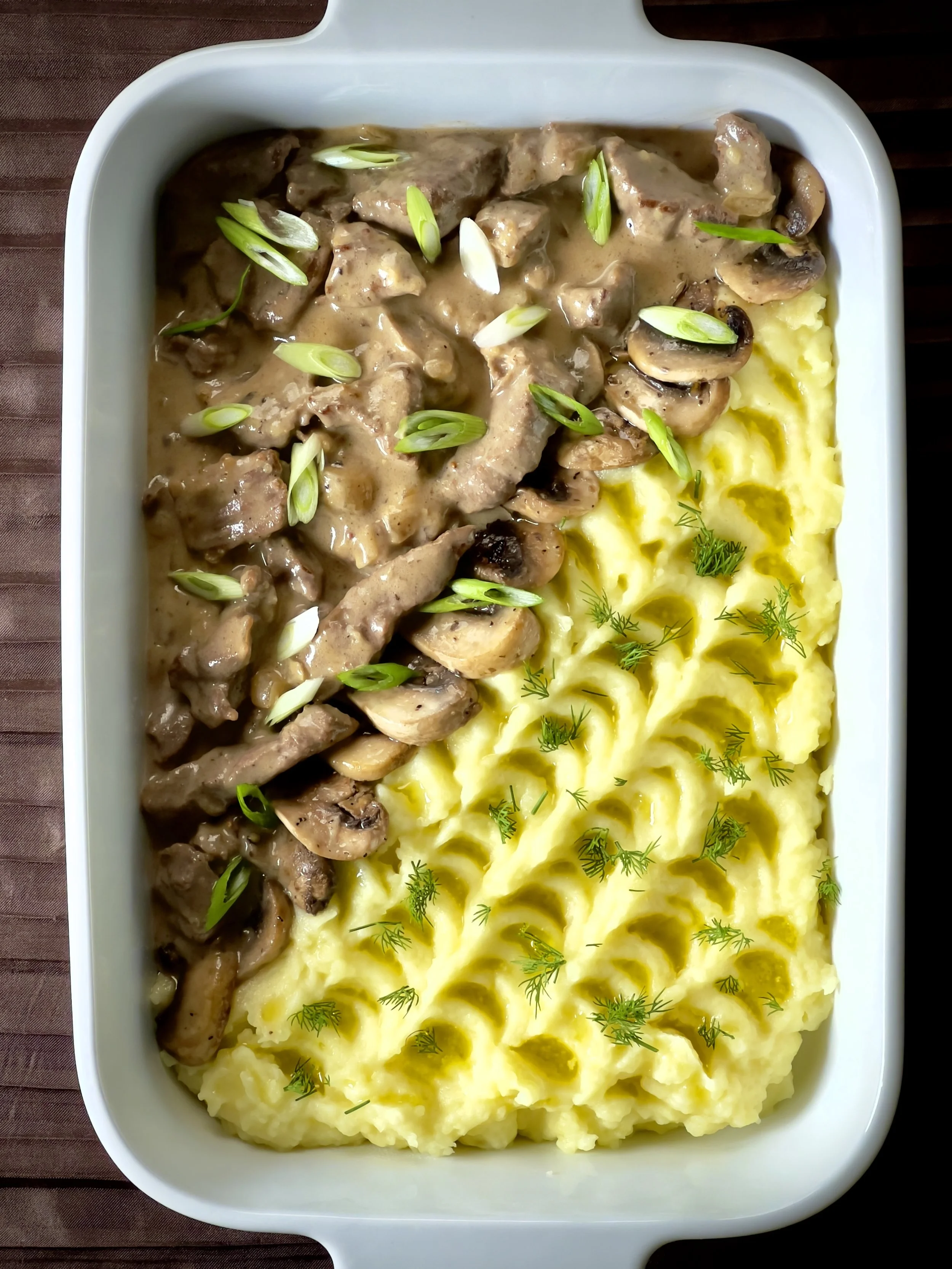 Grass fed Beef Stroganoff with creamy mushroom sauce and organic whipped potatoes.