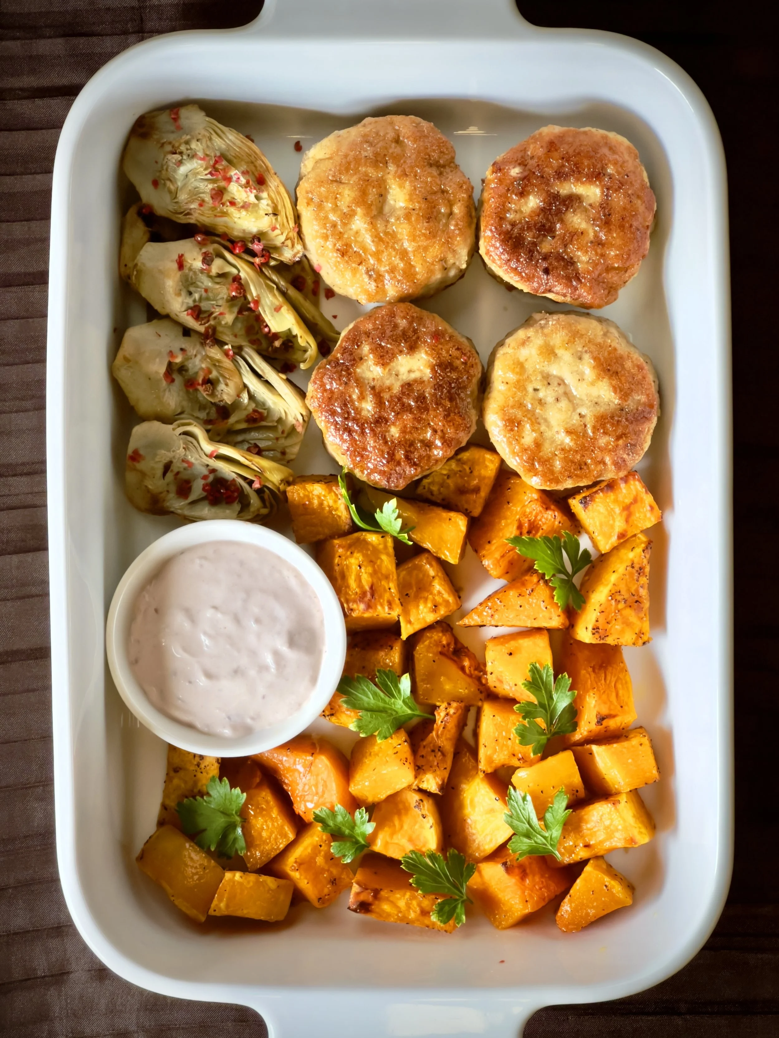 Organic turkey rissoles, sauteed artichokes, roasted butternut squash, creamy peppercorn sauce.