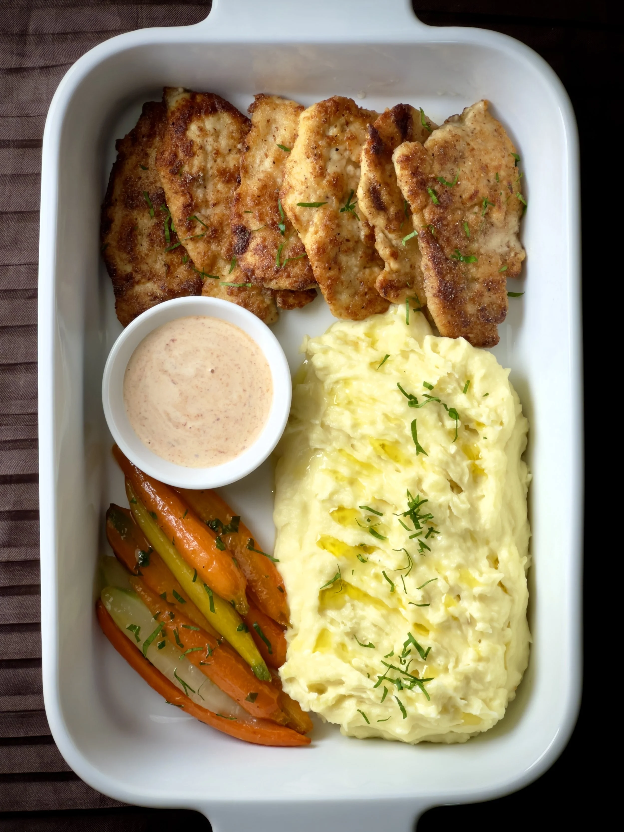 Pasture raised chicken scaloppine, organic mashed potatoes, roasted carrots. Served with roasted garlic cream sauce.