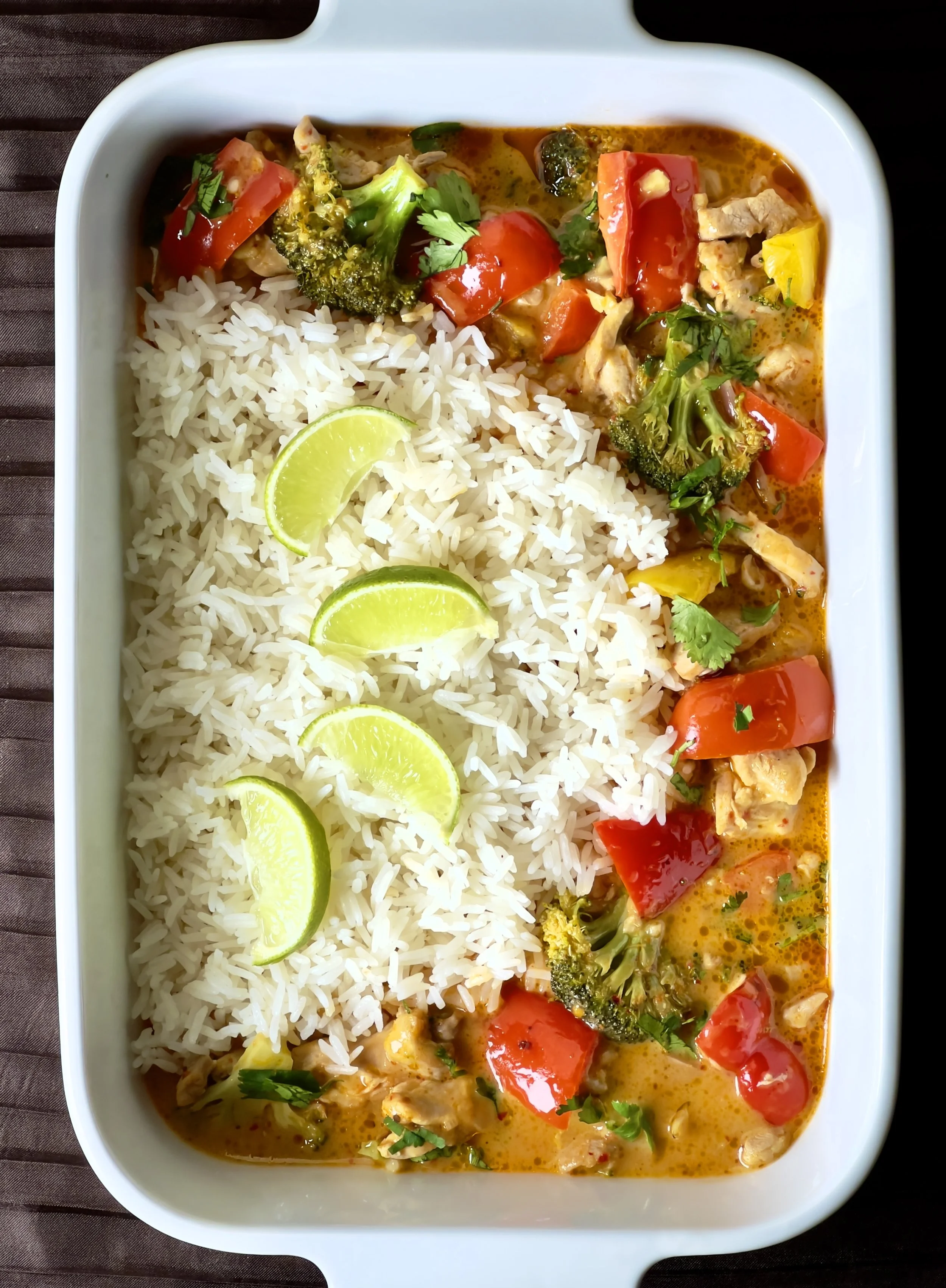 Thai red curry made with pasture raised chicken, organic coconut cream, organic bell peppers, broccoli and jasmine rice.