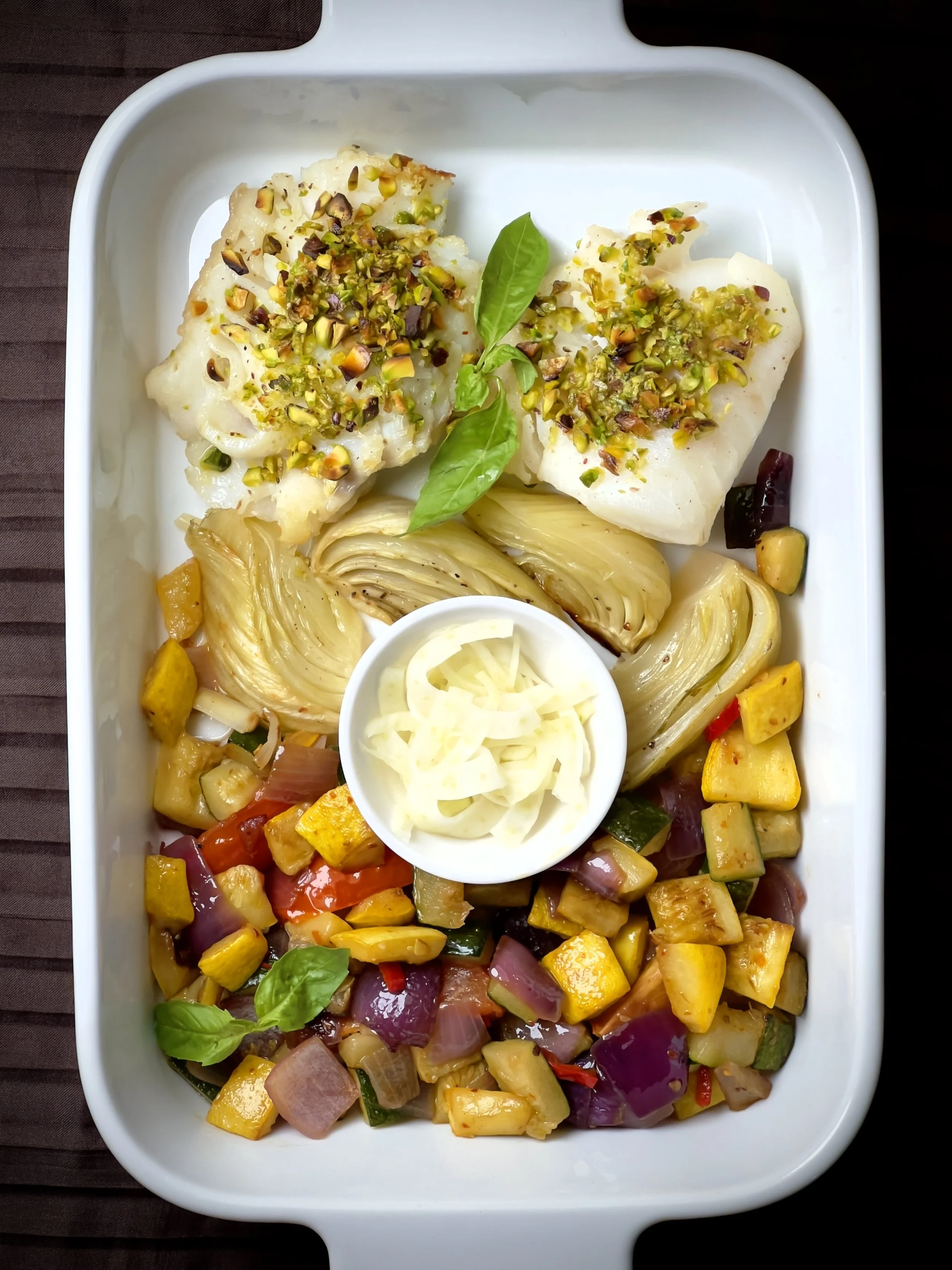Wild-caught cod with pistachio crust, paired with roasted fennel, pickled fennel, and sautéed zucchini, peppers, and onions. Finished with basil.