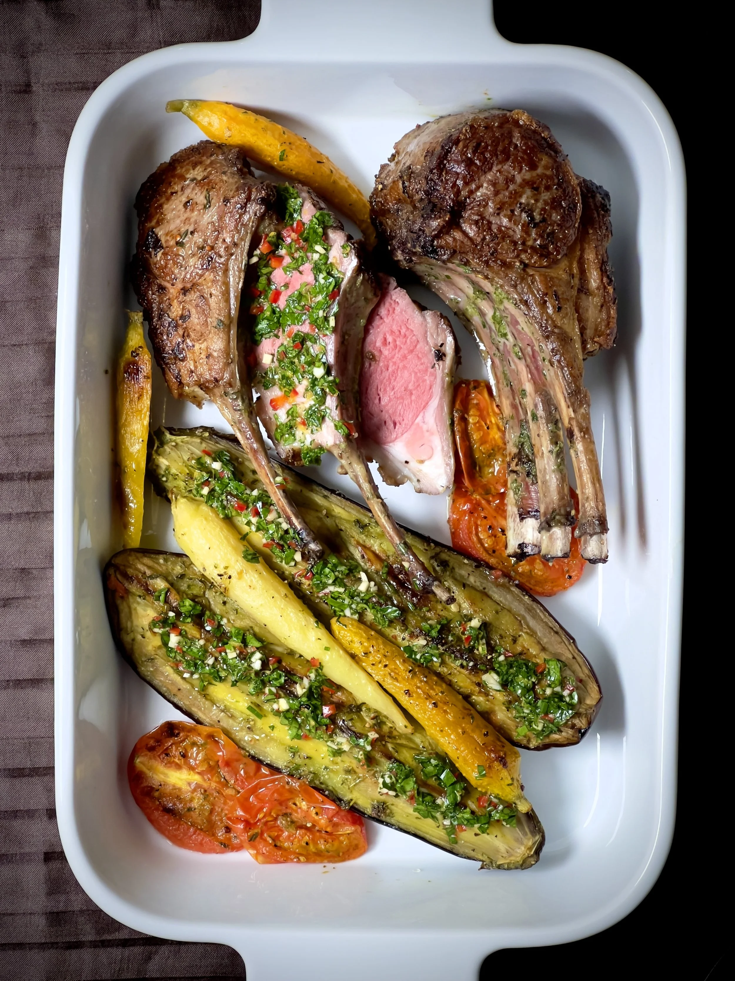 Seared lamb chops paired with roasted eggplant, carrots, and tomatoes, finished with a bright parsley, garlic and chili gremolata.