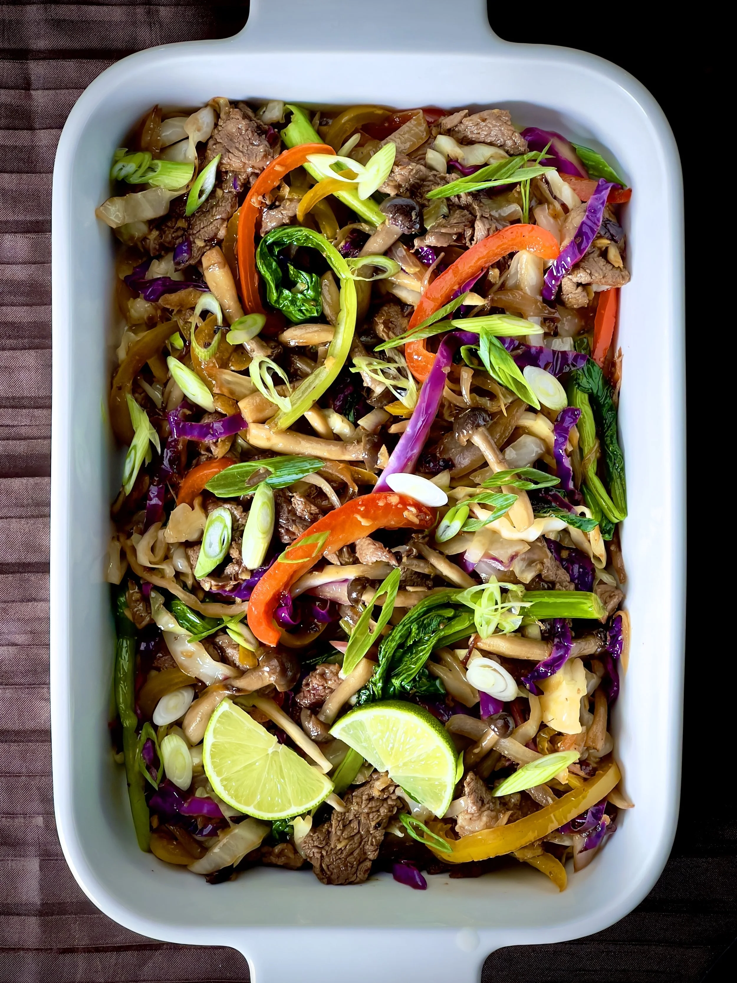 Pasture-raised beef sautéed with organic red and green cabbage, sweet bell peppers, mushrooms, and onions. Finished with fresh ginger, garlic, tamari, and a squeeze of lime. Garnished with fresh scallions.
