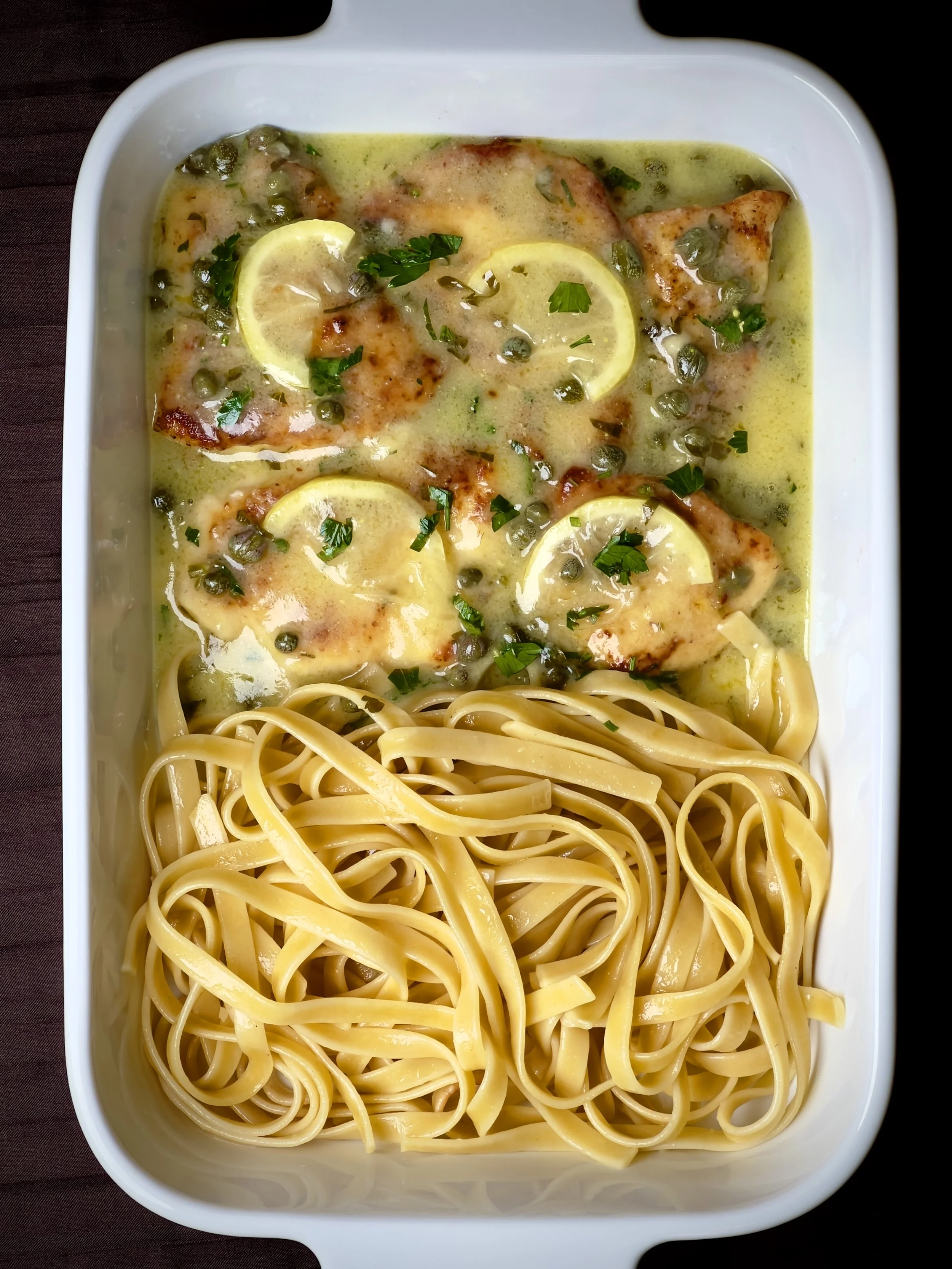 Pasture raised Chicken Piccata with flavorful grass fed butter lemon caper sauce. Served with choice of Italian durum pasta or gluten free pasta.