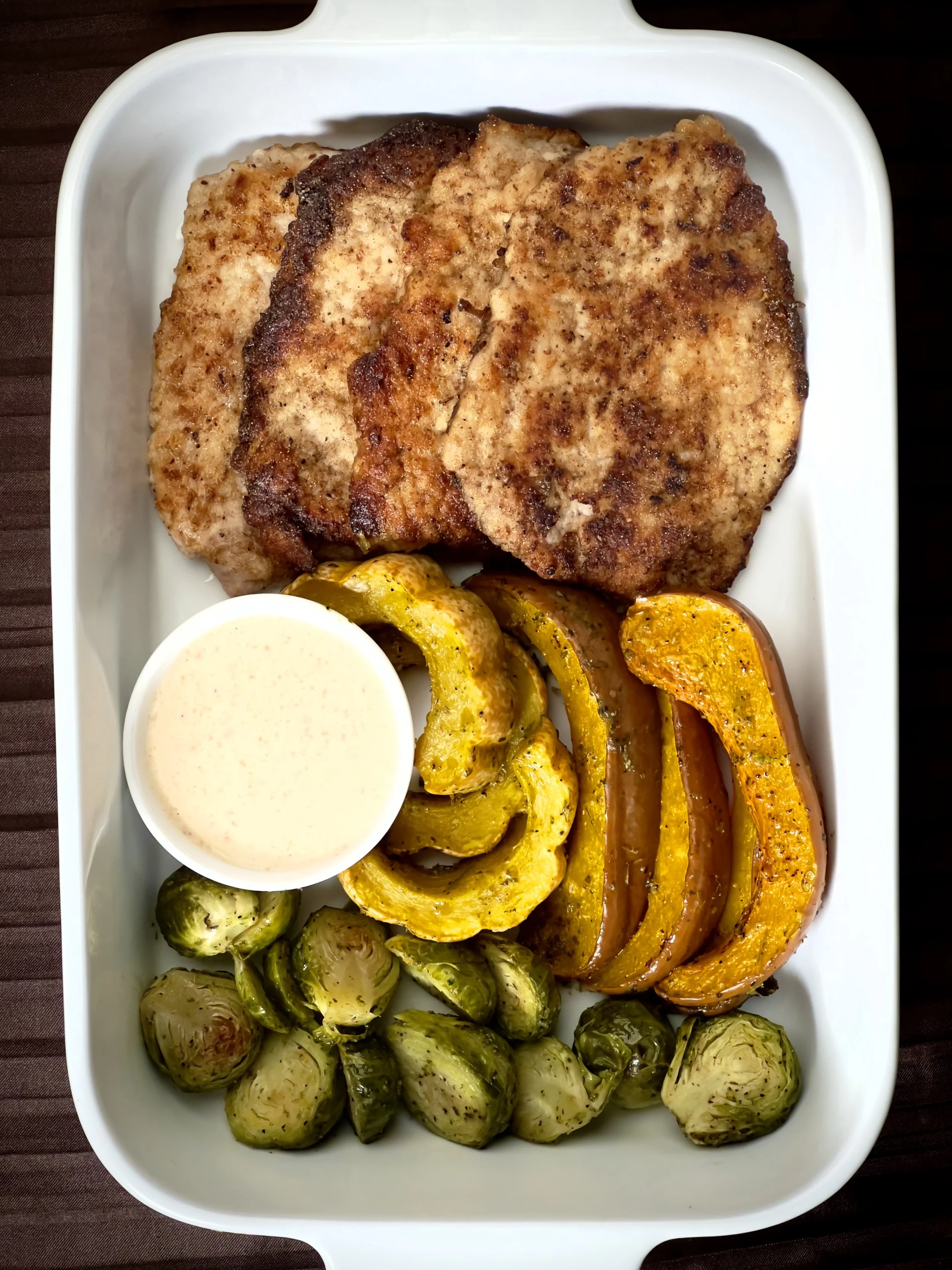 Seared pork cutlets lightly breaded in gluten-free flour. Served with herb roasted vegetables and homemade chipotle aioli.